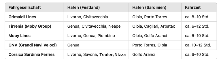 Mehrere Unternehmen bieten Fährverbindungen nach Sardinien an. Hier sind die wichtigsten: